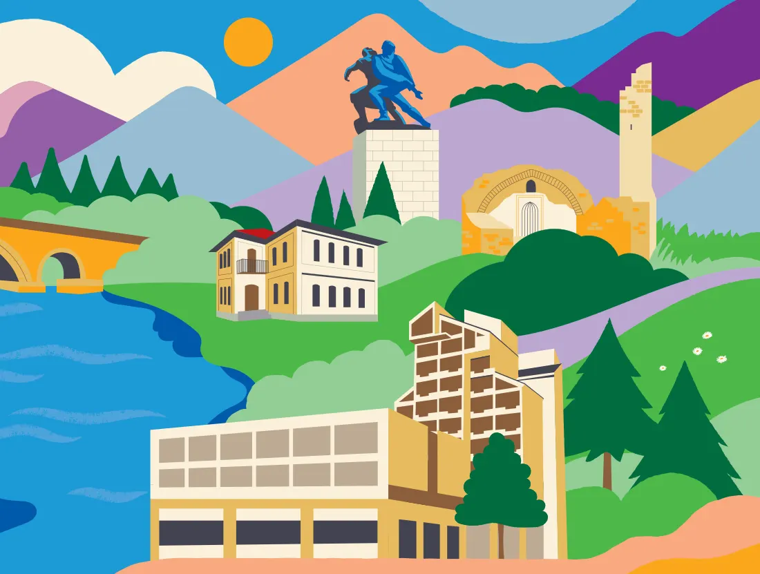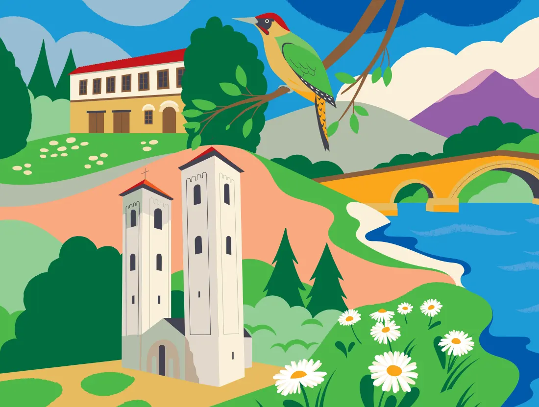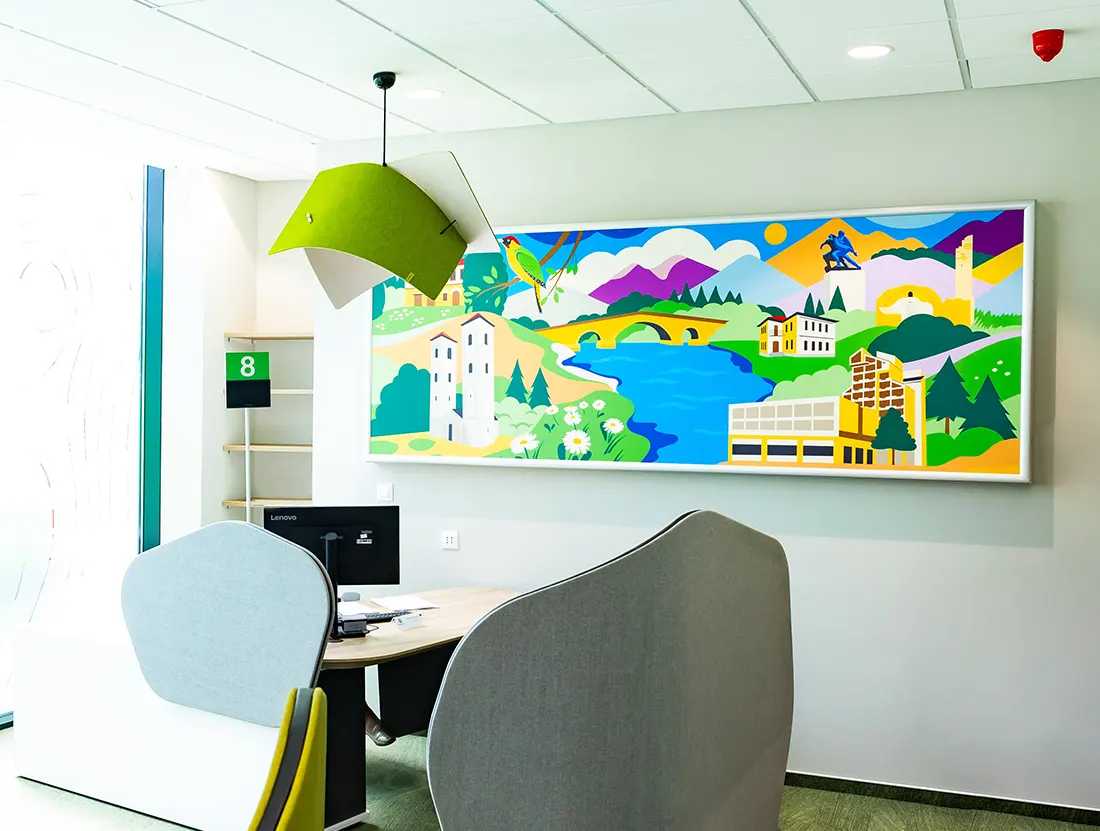 Wall graphic for CKB (www.ckb.me) bank office in Bijelo Polje, Montenegro. Illustration: Monika Lang (monikalang.com) Category: Print Date: 16.09.25. Share:
